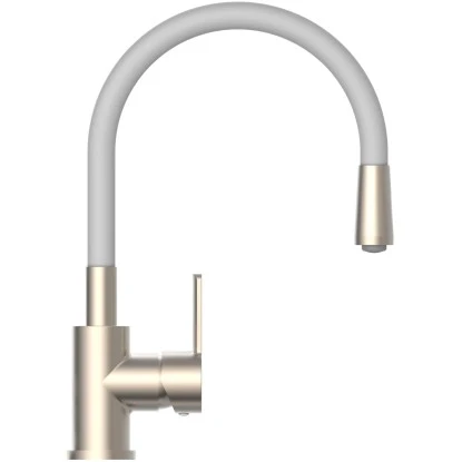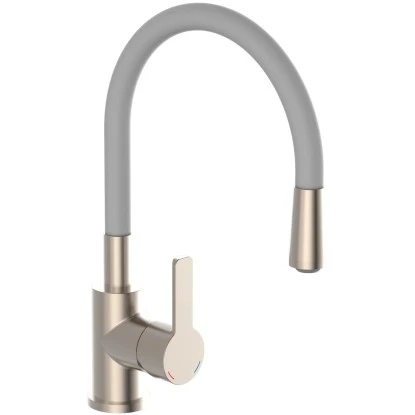 Flexo Spültischarmatur Edelstahloptik-Hellgrau. Diese elegante Küchenarmatur ist eine gelungene Kombination aus Funktion und Design Der farbige Rundbogenauslauf in Soft-Touch Qualität ist nicht nur eine Hingucker für die Spüle, sondern auch noch in alle Richtungen biegsam für einen großen Aktionsradius.