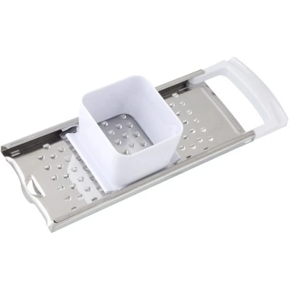 Der Fackelmann Spätzlehobel Arcadalina mit Griff und Schieber aus weißem Kunststoff, Reibe aus Edelstahl ist spülmaschinengeeignet.