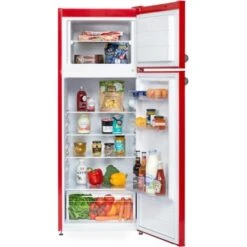 Die Respekta Kühl-/Gefrierkombination KS144 Vintage VC in Rot überzeugt vor allem durch ihre Funktionalität. Das Gerät besitzt neben einem Kühlinhalt von 171 Litern einen Nutzinhalt des Gefrierfachs von 42 Litern. Somit finden nicht nur Ihre frischen Lebensmittel und Getränke genügend Platz, sondern auch Vorräte, die tiefgefroren sind. Zusätzlicher Komfort wird durch verstellbare Füße, einen wechselseitigen Türanschlag, LED-Beleuchtung im Kühlraum oder auch dem automatischen Abtauverfahren im Kühlteil erreicht.